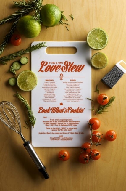 Who needs a paper wedding invitation? This couple gave their invites out on a small chopping board with a recipe on it. This design is a great example of lateral thinking, because not only does it inform guests about the big day, remains useful as kitchen utensil.