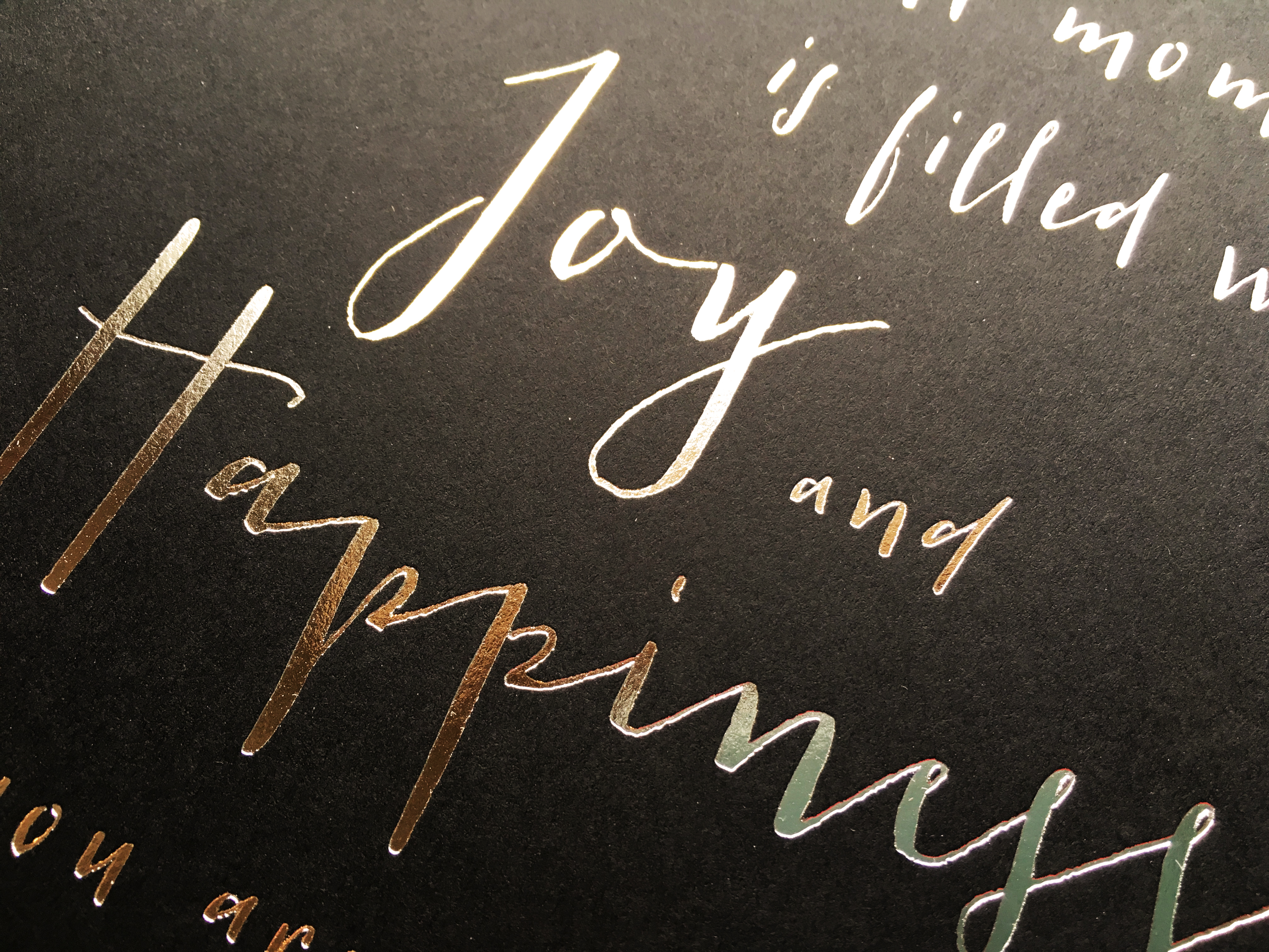 Golf foil stamped on black cover weight paper. Black paper will never go out of style and gold is as hot as it’s ever been! Choose from other foil colors including matte silver, metallized silver, matte gold, copper, rose gold, white, and red. Metallics are great for anytime, red is perfect for holiday invitations and we love rose gold for spring weddings. Also great for small business branding on custom printed business cards and note cards.