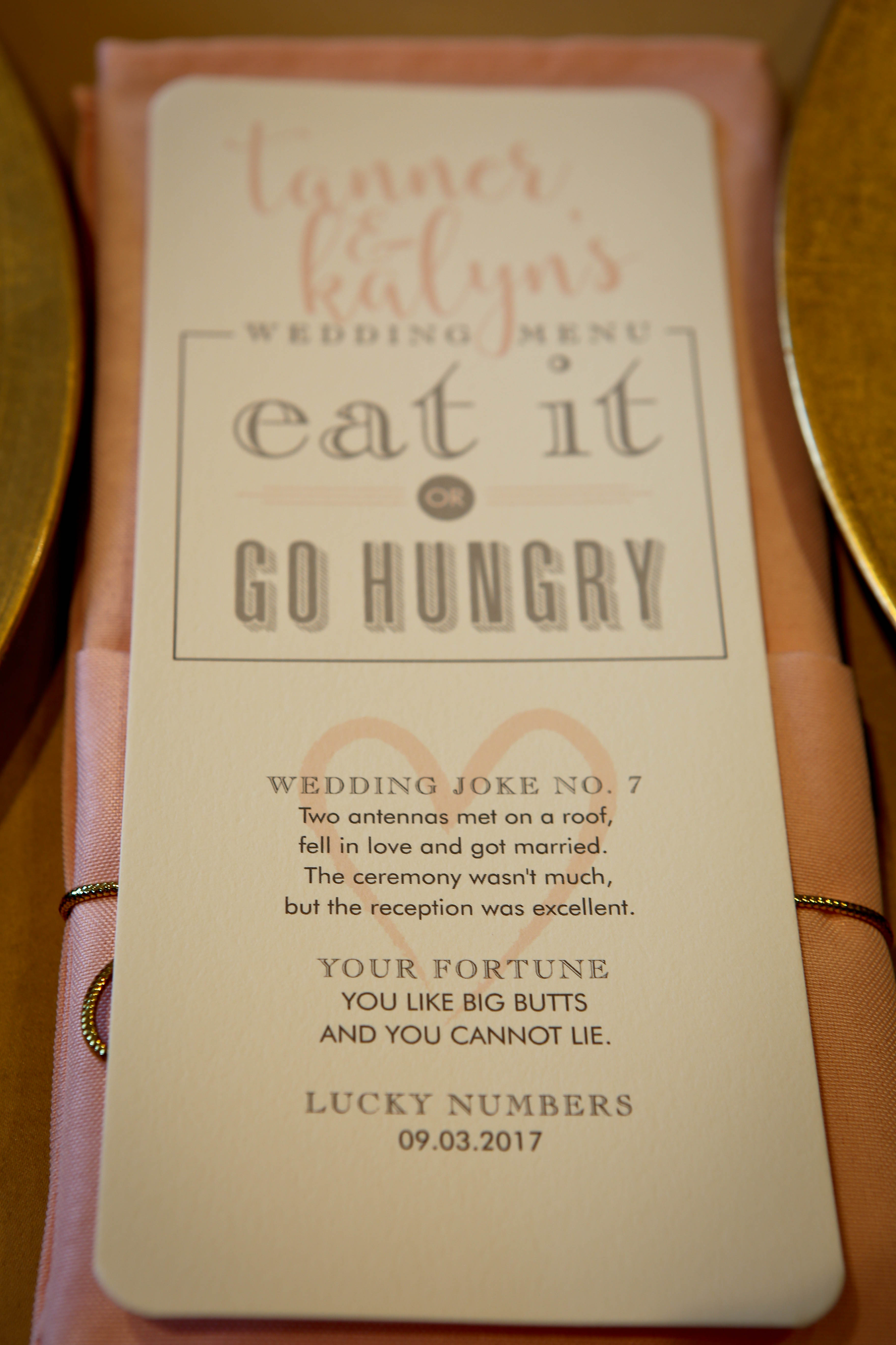 Custom printed #10 Flat Cards with Round Corners are perfect for a wedding menu. This Blush and dark gray design featured 10 different jokes and fortunes so each guest at a table had a unique menu to enjoy. The jokes were fun ice breakers and the design complemented the blush and white flowers along with the gold accents. This look accented the blush and gray wedding invitation that was foil stamped with gold and printed on double thick paper and also had round corners. Print as few as 10 menus or as many as you need, volume pricing appears in drop down menu on product page. Wholesale pricing available for creative professionals.